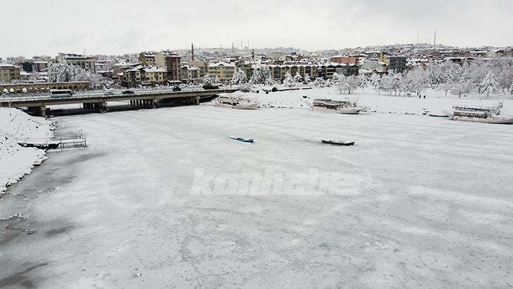 Kar yağışı Beyşehir Gölü yüzeyini tamamen beyaza bürürken, havadan görüntülenen göl kıyılarında ise kartpostallık görüntüler ortaya çıktı.