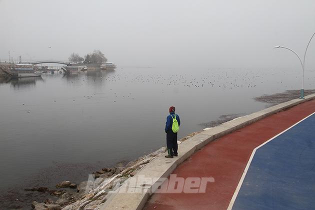 Kıyıda sisten kaybolan gölü izleyerek yürüyüş yapanların ve bisiklete binenlerin yanı sıra bazı vatandaşlar da göldeki su kuşlarına simit atarak beslemeye çalıştı. İlçenin simgesi haline gelen minyatür Aşk Adası da sisle birlikte ziyaretçilerin ilgi odağı olmaya devam etti.