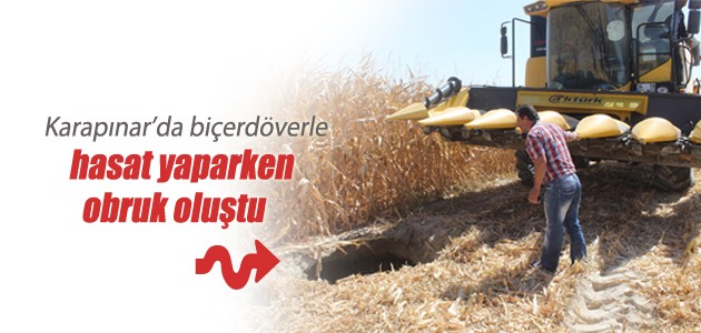 Konya'nın Karapınar ilçesindeki mısır tarlasında hasat yapan çiftçinin kullandığı biçerdöverin ön kısmı, aniden oluşan 2 metre çapına, 8 metre derinliğindeki obruğun içinde kaldı.