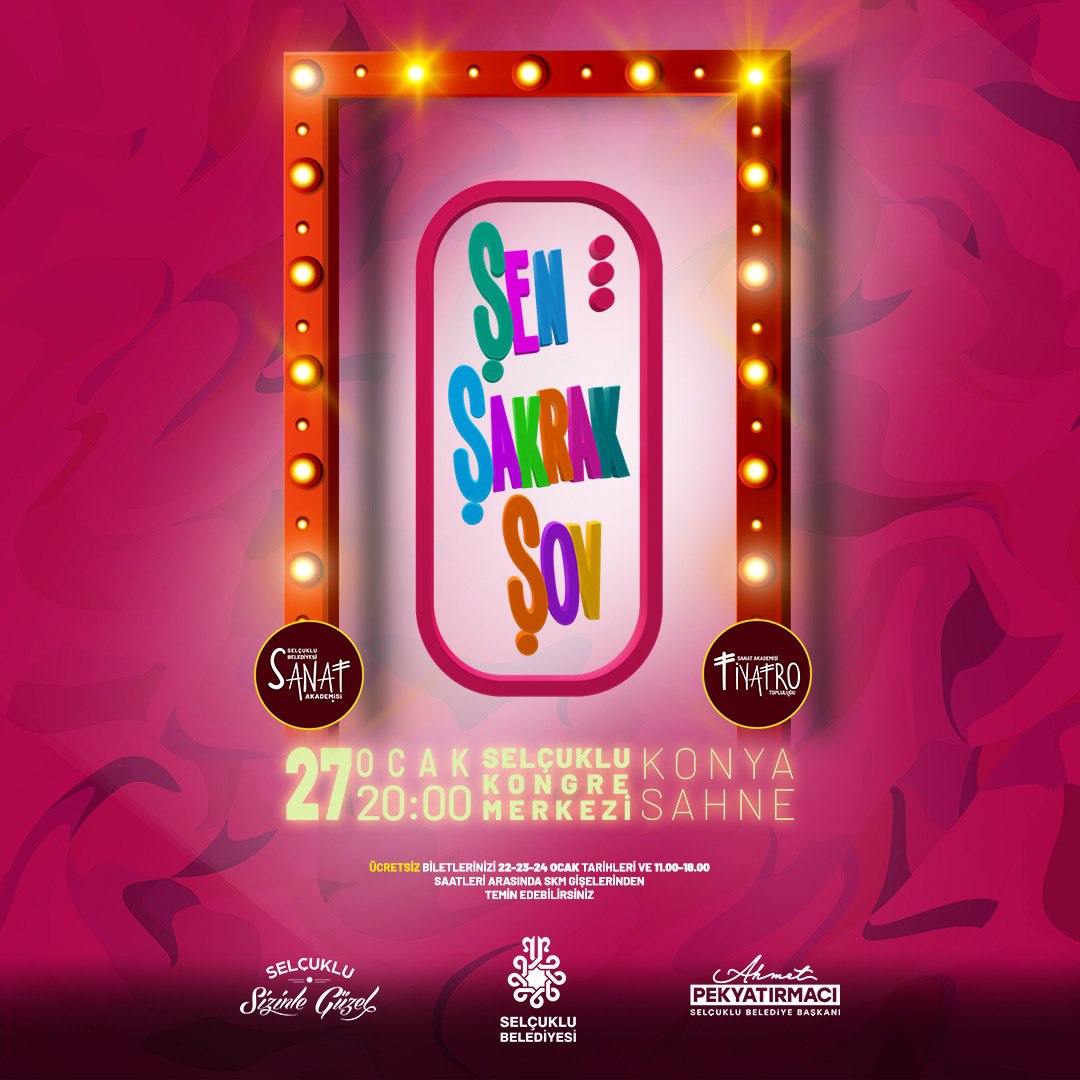 Bu kapsamda Selçuklu Belediyesi Sanat Akademisi bünyesinde eğitim alan Yetişkin Tiyatro Topluluğu tarafından ilk kez sahnelenecek olan “Şen Şakrak Şov” tiyatro oyunu 27 Ocak Pazartesi Günü saat 20.00’de Selçuklu Kongre Merkezi Konya Sahne’de seyirci ile buluşacak. Yine Akademi Genç Korosu tarafından hazırlanan “Erkin Koray Şarkıları” konseri ise 28 Ocak saat 20.00’de, Akademi Çocuk Tiyatro Topluluğu tarafından hazırlanan “Paldır Güldür Şov 5 ”isimli tiyatro oyunu ise 29 Ocak saat 20.00’de Selçuklu Kongre Merkezi Anadolu Sahne'de gerçekleştirilecek.