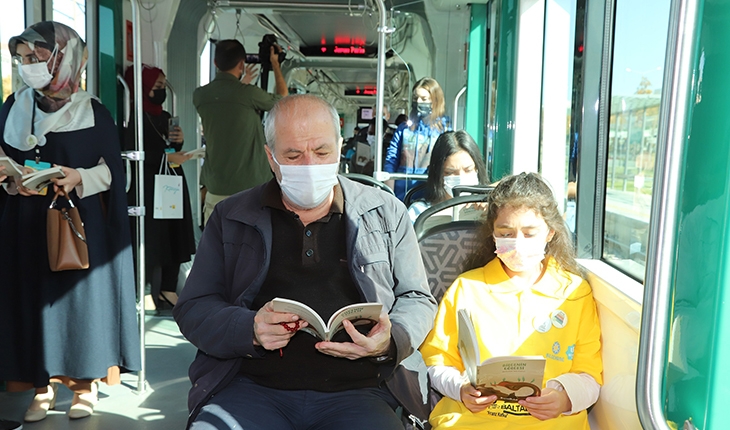 Konya Büyükşehir Belediyesi Bilgehane öğrencileri daha sonra farkındalık için tramvaylarda kitap okudu.