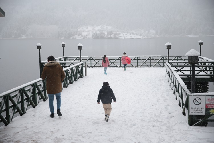Bolu'nun Abant, Kartalkaya ve Gerede Arkut Dağı Kayak Merkezi bölgelerinde kar yağışı sürüyor. Abant Gölü Milli Parkı'nda gece başlayan kar yağışı devam ediyor. Yağışın ardından beyaza bürünen milli parkta kış manzaraları oluştu. Konaklamak ve günübirlik tatil için Abant'a gelen tatilciler, kar altında yürüyüş yaptı, fotoğraf çektirdi.