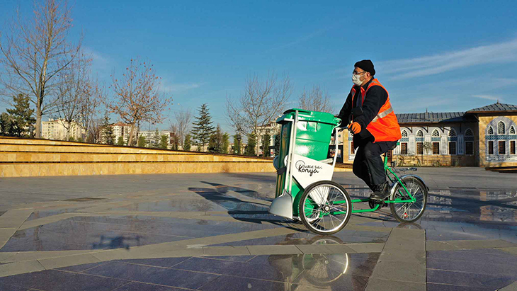 Konya Büyükşehir Belediyesi bünyesinde kullanılan çevre temizlik bisikletleri şehir merkezindeki temizlik çalışmalarında hem kolaylık sağlıyor hem de çevreci yönüyle dikkat çekiyor.