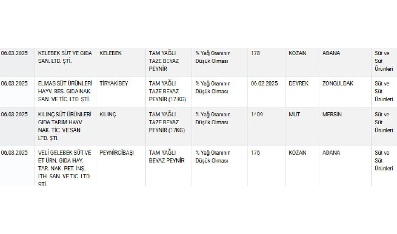 Tarım ve Orman Bakanlığı, gıda güvenliğini sağlamak amacıyla gerçekleştirdiği denetimlerde, taklit ve tağşiş listesine yeni markalar ekledi. Bakanlık, son güncellenen listede 6 beyaz peynir markasının ürünlerinde usulsüzlük tespit etti.