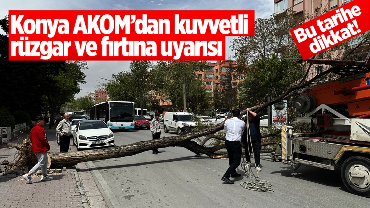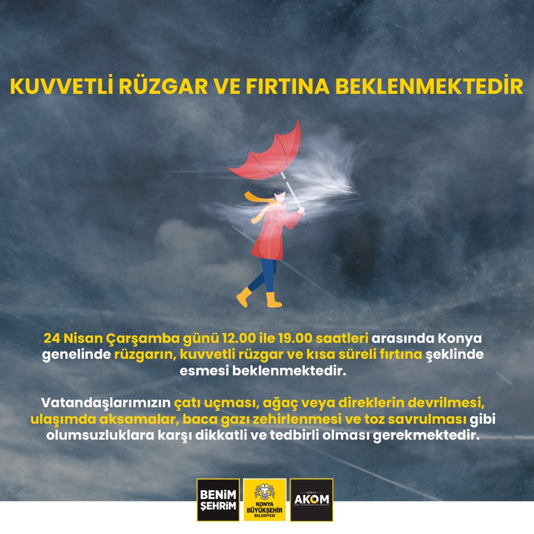 AKOM, kuvvetli rüzgâr ve fırtınanın beklendiği kentte, Konyalıları uyardı.Konya AKOM’dan (Afet Koordinasyon Merkezi) yapılan açıklamada, "24 Nisan Çarşamba günü 12.00 ile 19.00 saatleri arasında Konya genelinde rüzgarın, kuvvetli rüzgar ve kısa süreli fırtına şeklinde esmesi beklenmektedir. Vatandaşlarımızın çatı uçması, ağaç veya direklerin devrilmesi, ulaşımda aksamalar, baca gazı zehirlenmesi ve toz savrulması gibi olumsuzluklara karşı dikkatli ve tedbirli olması gerekmektedir” denildi.