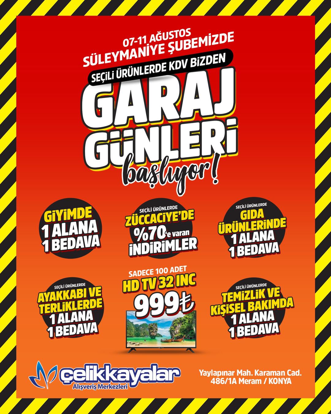 Konya'nın yerel zincir marketlerinden Çelikkayalar, yoğun rağbet gören "Garaj Günleri" kampanyasını şimdi Süleymaniye şubesine taşıyor! 7-11 Ağustos tarihleri arasında gerçekleşecek bu kampanya önceki lokasyonlarda olduğu gibi yine inanılmaz fırsatlarla dolu olacak.