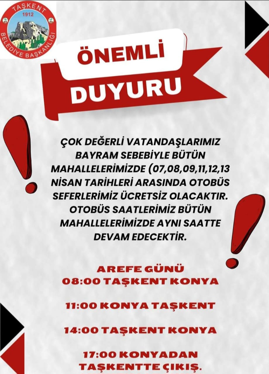 Bayram sebebiyle bütün mahallelerde 07, 08, 09,10, 11,12,13 nisan tarihleri arasında otobüs seferleri 7 gün ücretsiz olacak. Otobüs saatleri bütün mahallelerde aynı saatte devam edecek.