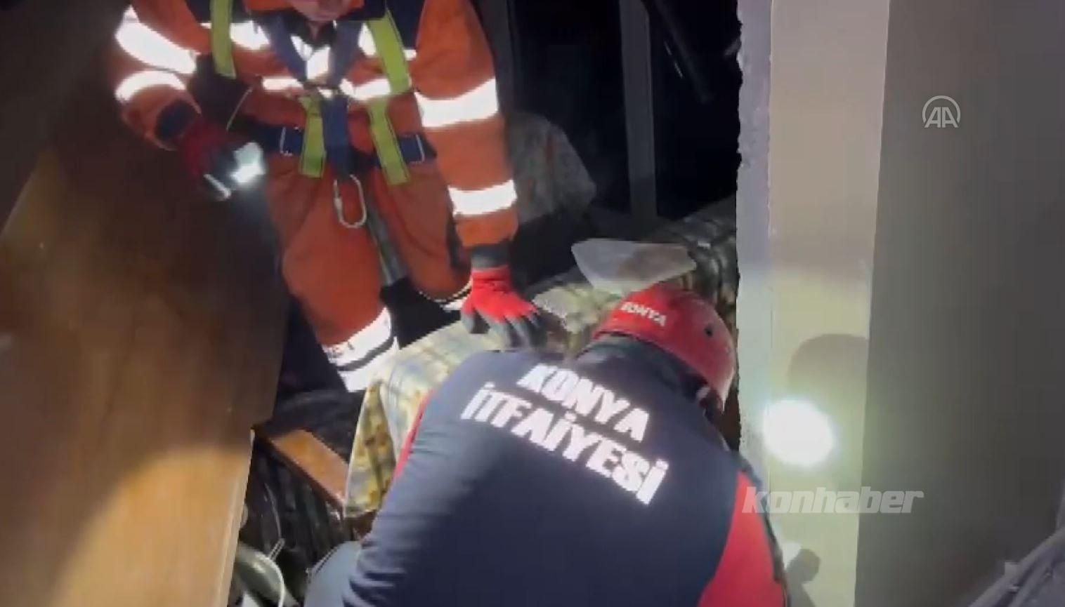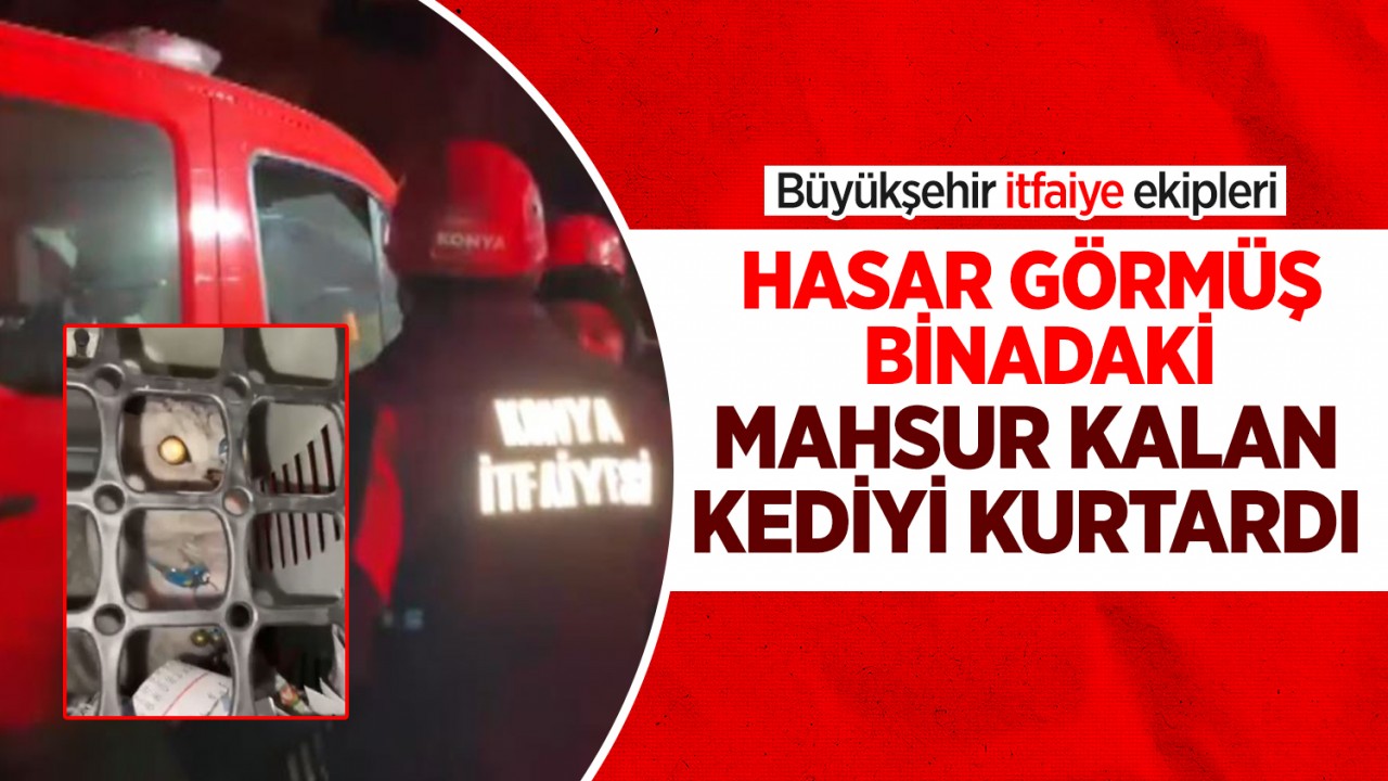Konya Büyükşehir Belediyesi itfaiye ekipleri, Cebrail Mahallesi'nde depremde hasar gören Saadet Apartmanı'nın 5. katında bir kedinin mahsur kaldığına yönelik sosyal medyada yer alan yardım çağrısı üzerine harekete geçti.