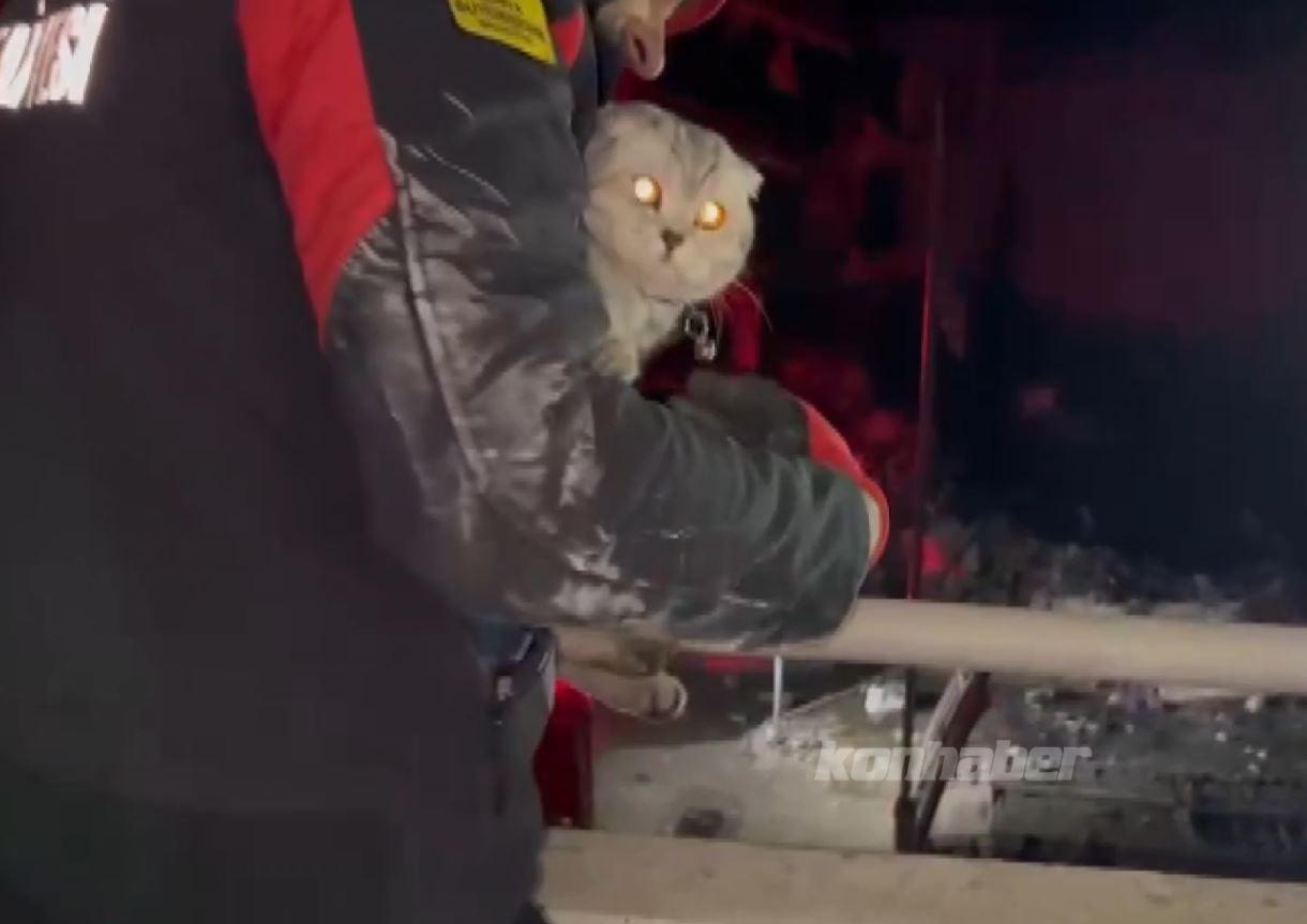 Hatay'ın Antakya ilçesinden, "asrın felaketi" olarak nitelenen Kahramanmaraş merkezli depremlerde hasar gören bir binada mahsur kalan kedi itfaiye ekiplerince kurtarıldı.