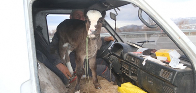 Konya'nın Beyşehir ilçesinde 4 günlük buzağının minibüsün ön koltuğunda yolculuğu ilginç görüntüler oluşturdu.