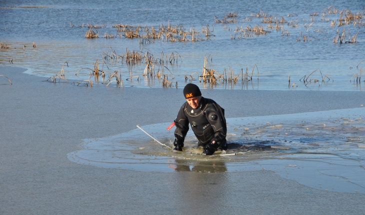 Dondurucu soğukta özel kıyafetlerini giyen ekipler gölette buzu kırarak, aranmadık yer bırakmadı.