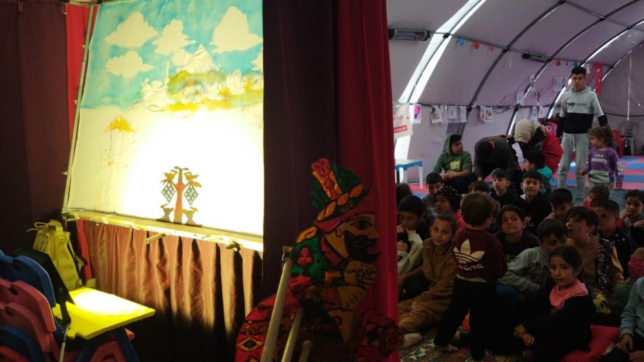 KARAKUM Müdürü ve BUÜ Güzel Sanatlar Fakültesi Dramatik Yazarlık Bölümü Ana Sanat Dalı Başkanı Dr. Öğretim Üyesi İbrahim Öztahtalı, Karagöz oynatıcısı (hayali) Nevzat Aydın ve asistan Emir Kaçar, afetin çocuklarda oluşturduğu travmayı azaltmak için malzemelerini hazırlayıp Bursa'dan karavanla yola çıktı.