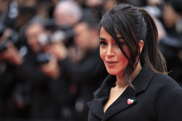Cezayir asıllı Fransız oyuncu Leila Bekhti, Filistin ile dayanışmanın sembolü olan karpuz motifli bir broş taktı.