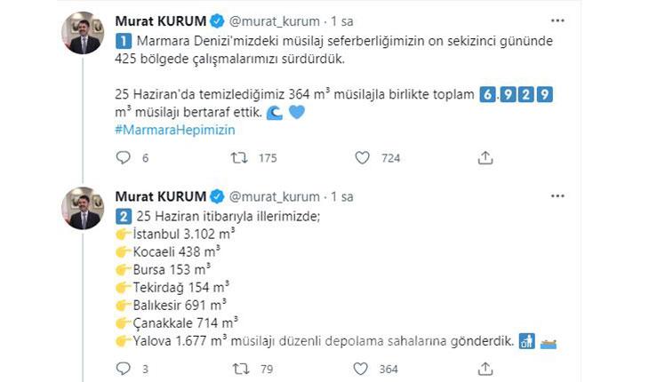Bakan Kurum, "Marmara Denizi'mizdeki müsilaj seferberliğimizin on sekizinci gününde 425 bölgede çalışmalarımızı sürdürdük. 25 Haziran'da temizlediğimiz 364 metreküp müsilajla birlikte toplam 6.929 metreküp müsilajı bertaraf ettik." dedi.