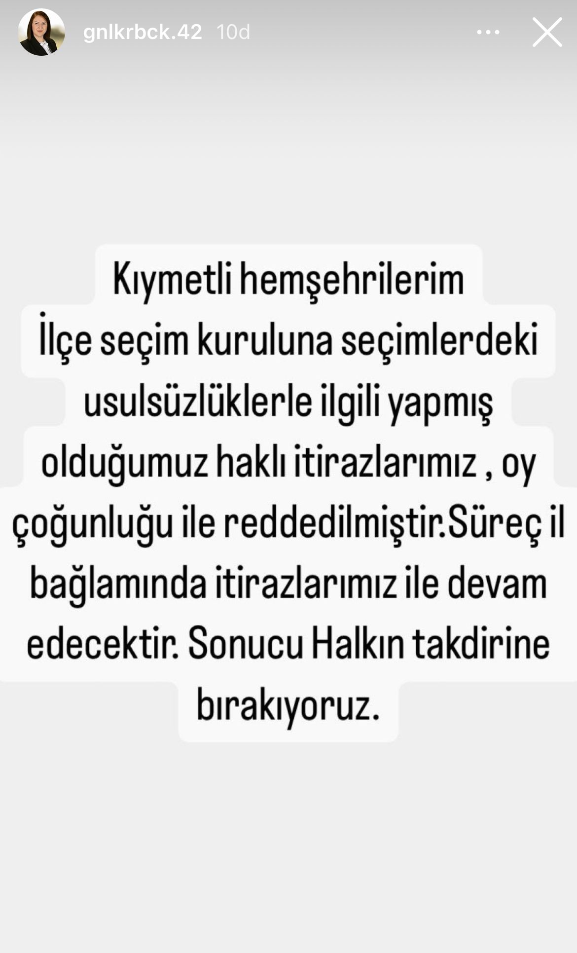 Karabacak paylaşımında, "Kıymetli hemşehrilerim İlçe seçim kuruluna seçimlerdeki usulsüzlüklerle ilgili yapmış olduğumuz haklı itirazlarımız, oy çoğunluğuyla reddedilmiştir. Süreç İl bağlamında itirazlarımız ile devam edecektir. Sonucun Halkın takdirine bırakıyoruz." ifadelerinde bulundu.