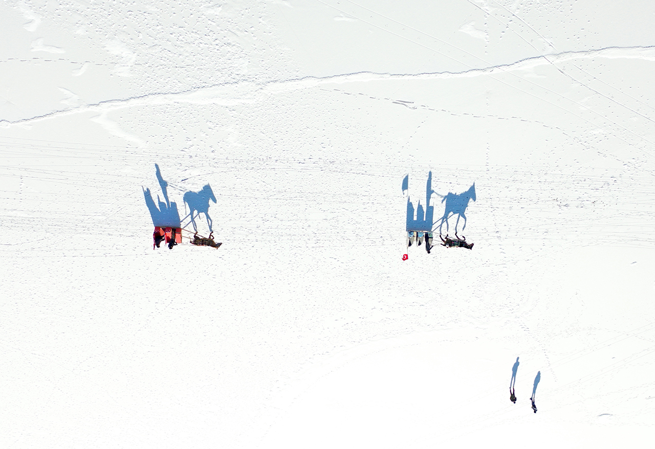 Çıldır Gölü'nde atlı kızakçılık yapan Davut Taşdemir, AA muhabirine, Doğu Anadolu Bölgesi'nin en büyük ikinci gölü Çıldır'da atlı kızak turlarının başladığını söyledi.