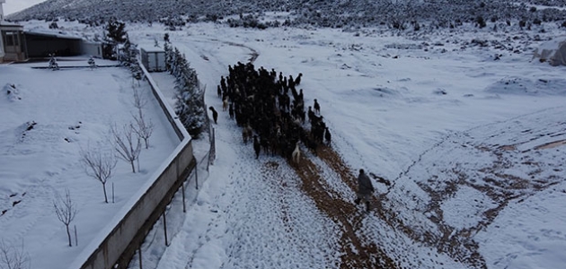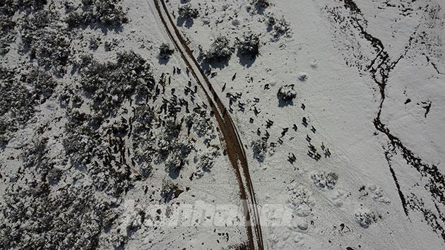 Keçi sürülerinin kar örtüsündeki yayılımı, havadan da görüntülendi.Besicilik yapan 38 yaşındaki Musa Davarcı, doğduğu günlerden bu yana ata mesleğini sürdürdüğünü belirterek, yaz kış demeden 150 keçisini her gün yayılıma çıkardığını söyldi.
