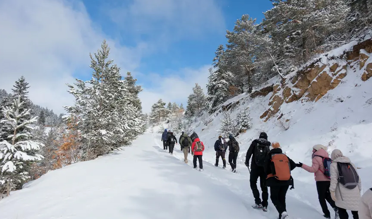 Gümüşhane'nin dağları kar yağışıyla kartpostallık görüntülere büründü.Bunu fırsat bilen dağcılar, kış mevsiminin büyüleyici atmosferinde yürüyüşlerine ara vermeden devam ediyor.