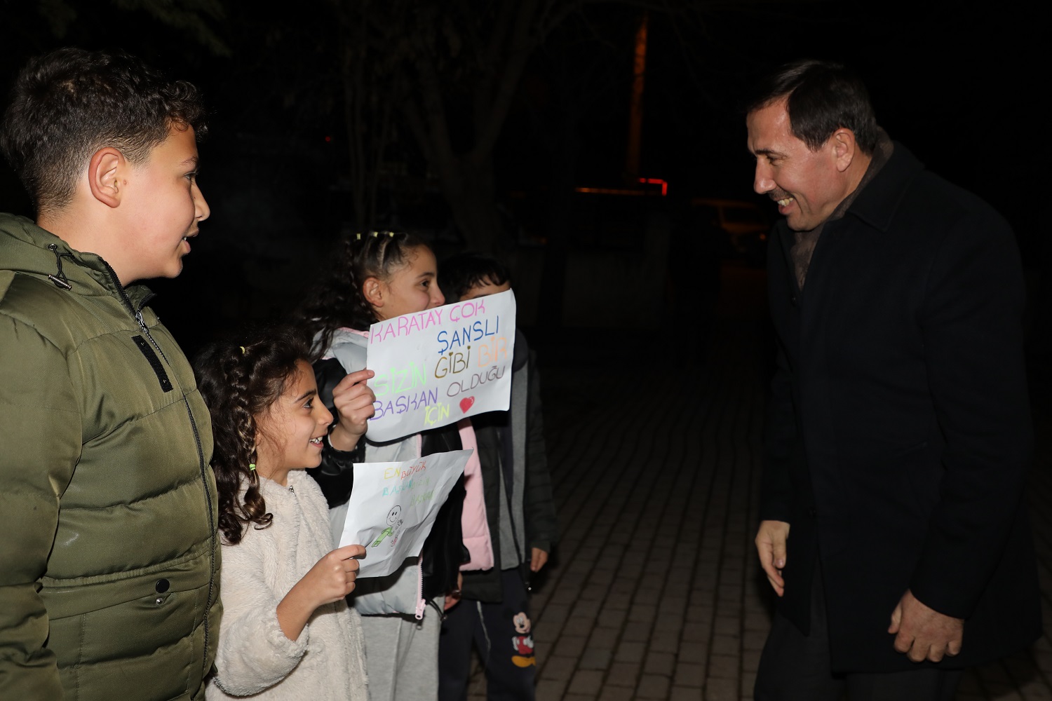 Teravih namazından sonra mahalle sakinleriyle sohbet eden Başkan Kılca, çocuklar tarafından büyük bir coşkuyla karşılandı. Ellerinde “Karatay Çok Şanslı Sizin Gibi Başkan Olduğu İçin” yazılı notlar bulunan çocuklar, Başkan Kılca’ya olan sevgilerini iletti.