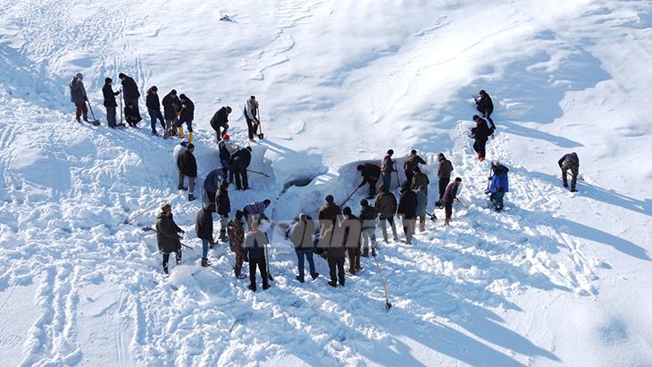 Vatandaşlar araçlarla geldikleri dağda, "kar basma" olarak adlandırılan etkinlikten yanlarında getirdikleri kürek ve testerelerle karları küp şeklinde keserek çukurun içerisine dolduruyor. Çukura inen 3-4 kişi, küreklerle karları sıkıştırarak istifliyor.