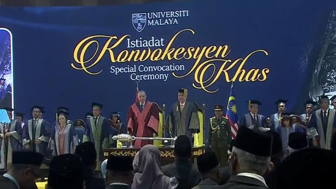 Cumhurbaşkanı Erdoğan Malezya'da Putrajaya Uluslararası Kongre Merkezi'nde Perak Sultanı Nazrin Şah tarafından uluslararası ilişkiler alanında fahri doktora beratı takdim edildi.