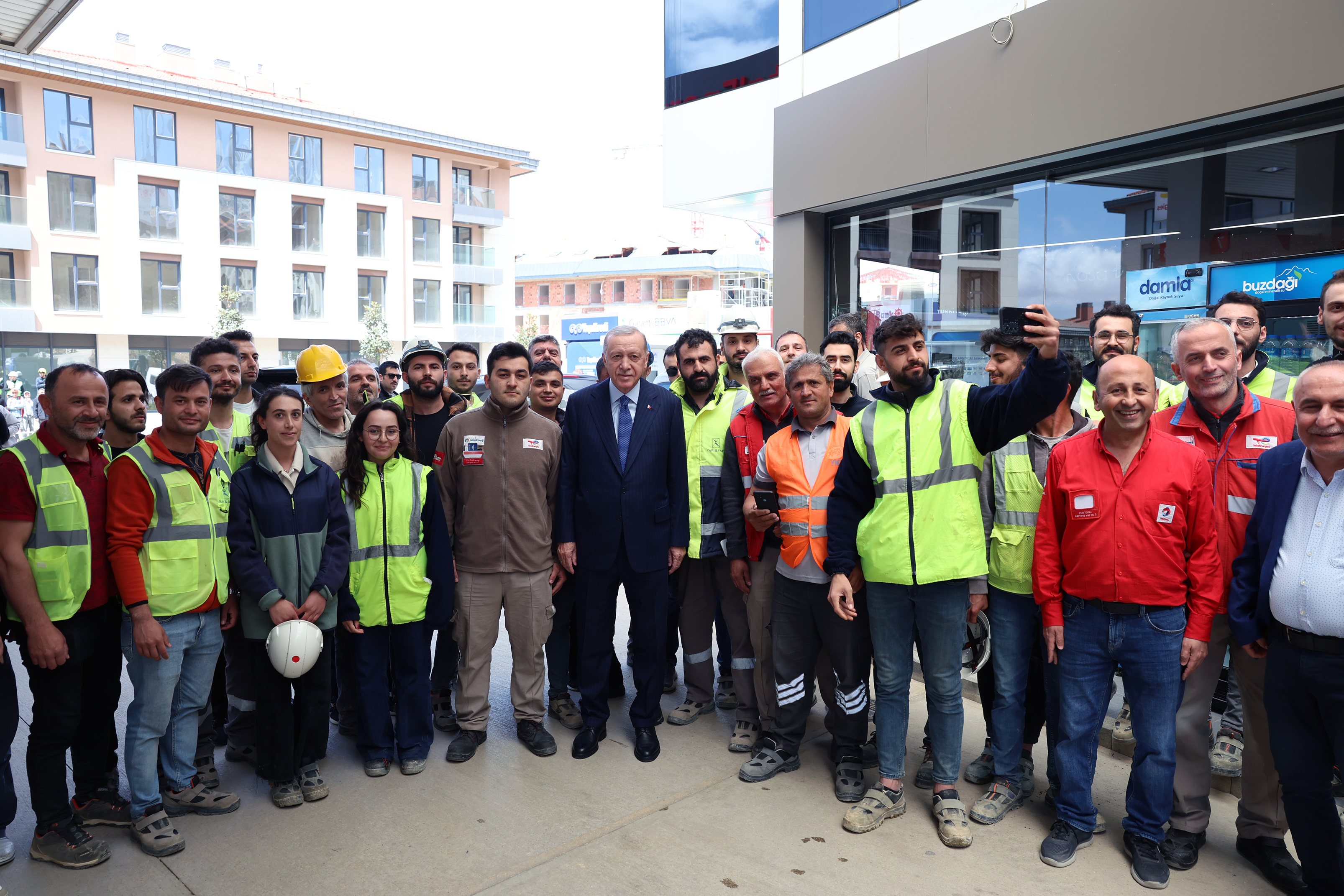 Firma yöneticileri ve çalışanlarıyla sohbet eden Erdoğan, çıkışta kendisini bekleyen Kirazlıtepe Kentsel Dönüşüm Uygulama Alanı'nda görevli işçilerle fotoğraf çektirdi.