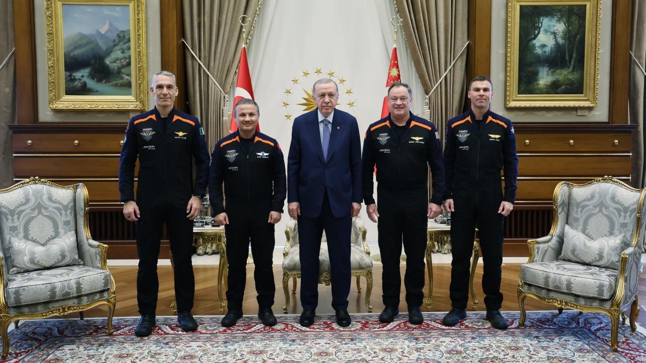 Cumhurbaşkanı Erdoğan, Ax-3 Uzay Misyonu mürettebatını kabul etti. Kabulde, Alper Gezeravcı, Michael Lopez-Alegria, Walter Villadei ve Marcus Wandt yer aldı.