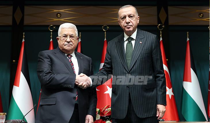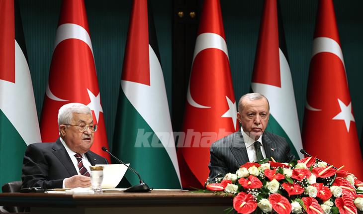 Ankara'da Filistin Devlet Başkanı Mahmud Abbas'la yaptığı ikili görüşmenin ardından ortak basın toplantısında konuşan Erdoğan, "Filistin halkıyla dayanışmamızı, Filistin davamızı en güçlü şekilde sürdürüyoruz. Türkiye iki devletli çözümü her platformda savunmaktadır. İsrail saldırılarında sivil can kayıplarına ilişkin tepkimizi açık ve net bir şekilde ortaya koyduk" ifadelerini kullandı.