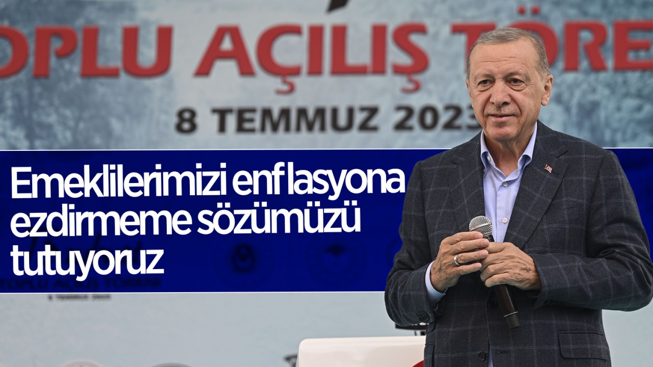Cumhurbaşkanı Recep Tayyip Erdoğan, Bayburt'ta toplu açılış töreninde açıklamalarda bulundu. Erdoğan, "(Emekli maaşları) Refah payı ile zam oranını yüzde 25’e çıkarıyoruz. Enflasyonun üzerinde artışlarla emeklilerimizi enflasyona ezdirmeme sözümüzü tutuyoruz" dedi.