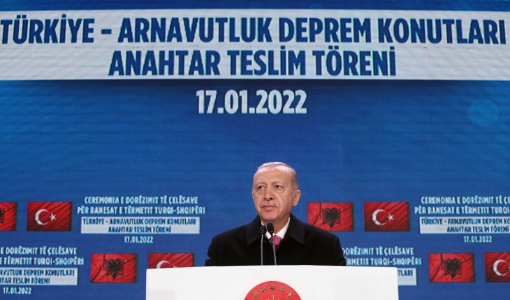 2019 yılında 6,4 büyüklüğündeki depremin ardından Türkiye'nin yardım elini uzatan ilk ülkelerden biri olduğuna dikkati çeken Erdoğan, "Arnavutluk’ta 26 Kasım 2019'da 6,4 büyüklüğünde meydana gelen ve 50’den fazla kişinin ölümüne, 3 binden fazla kişinin yaralanmasına sebep olan ve 11 belediyenin altyapısına zarar veren deprem felaketinde Türkiye kardeş Arnavutluk’a yardım elini uzatan ilk ülkelerden biri olmuştur. Arnavutluk vatandaşlarının enkazdan kurtarılması için süratle arama kurtarma ekipleri gönderilmiştir. Deprem yaralarını bir nebze olsa da sarabilmek için, Toplu Konut İdaresi Başkanlığı (TOKİ) tarafından Arnavutluk’un Laç şehrinde mağdur olan aileler için 500’den fazla konut inşa edilmiştir. İnşa edilen konutlar 17 Ocak 2022’de teslim edilecektir" ifadelerine yer verdi.