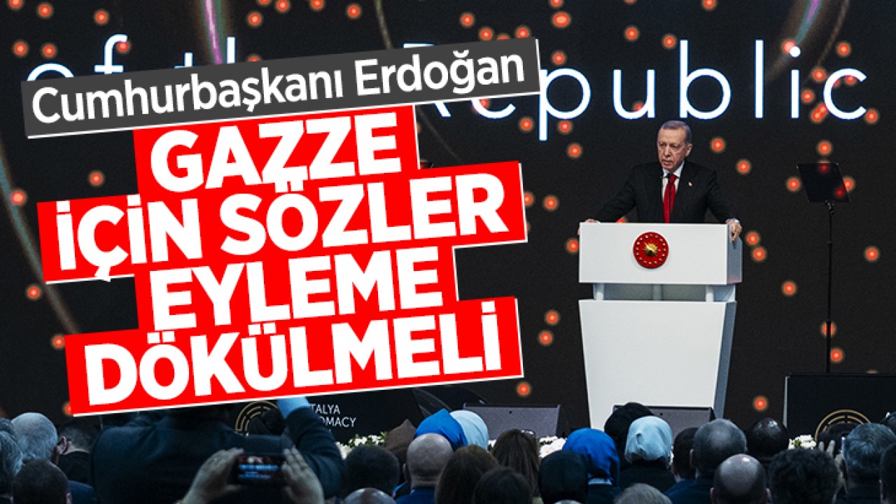 Erdoğan, konuşmasında şunları kaydetti; Antalya Diplomasi Forumu'nun 3'üncü buluşması münasebetiyle sizlerle beraber olmaktan büyük bir memnuniyet duyuyorum. Bilindiği gibi 6 Şubat 2023'te yaşadığımız asrın felaketi nedeniyle forumumuzu geçtiğimiz yıl iptal etmek durumunda kalmıştık. Ülkemizin 11 ilini ve 14 milyon vatandaşımızı etkileyen 53 binden fazla canımızı yitirdiğimiz deprem felaketinin yaralarını hızla sarıyoruz. Bu zorlu süreçte dost ve kardeş ülkelerden gördüğümüz maddi manevi desteği burada özellikle ifade etmek isterim. Dünyanın neresinde olursa olsun acımızı yürekten paylaşan dayanışma ve desteklerini esirgemeyen dostlarımıza bir kez daha ülkem ve milletim adına şükranlarımı sunuyorum.Anadolu'nun manevi mimarlarından Hz. Mevlana'nın çağları aşan şu sözünün hikmetine bir kez daha şahitlik ettik; Ümitsizliğin ardında nice ümitler vardır. Karanlığın ardında nice güneşler vardır. Millet olarak destekleriyle, dualarıyla, katkılarıyla en zor günümüzde bizlere umut aşılayan dostlarımızın kadirşinaslığını asla unutmayacağız. Rabbim ülkemiz ve milletimizle birlikte tüm insanlığı bu tür tabii afetlerden korusun diyorum. Depremlerde vefat eden kardeşlerimizi bir kez daha rahmetle yad ediyorum.