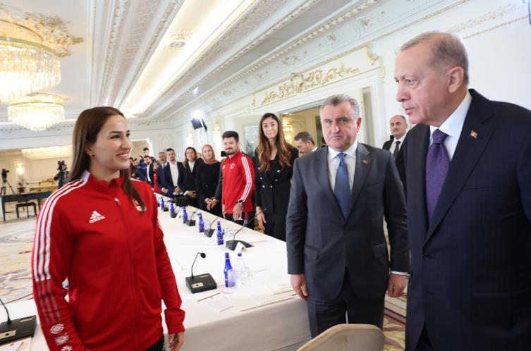 Erdoğan, 2024 Paris Olimpiyatlarına katılacak milli sporculardan madalya sözü aldı. Buluşma, Erdoğan ile sporcular arasındaki diyaloglar ve genç müzisyenlerin performansıyla renklendi.
