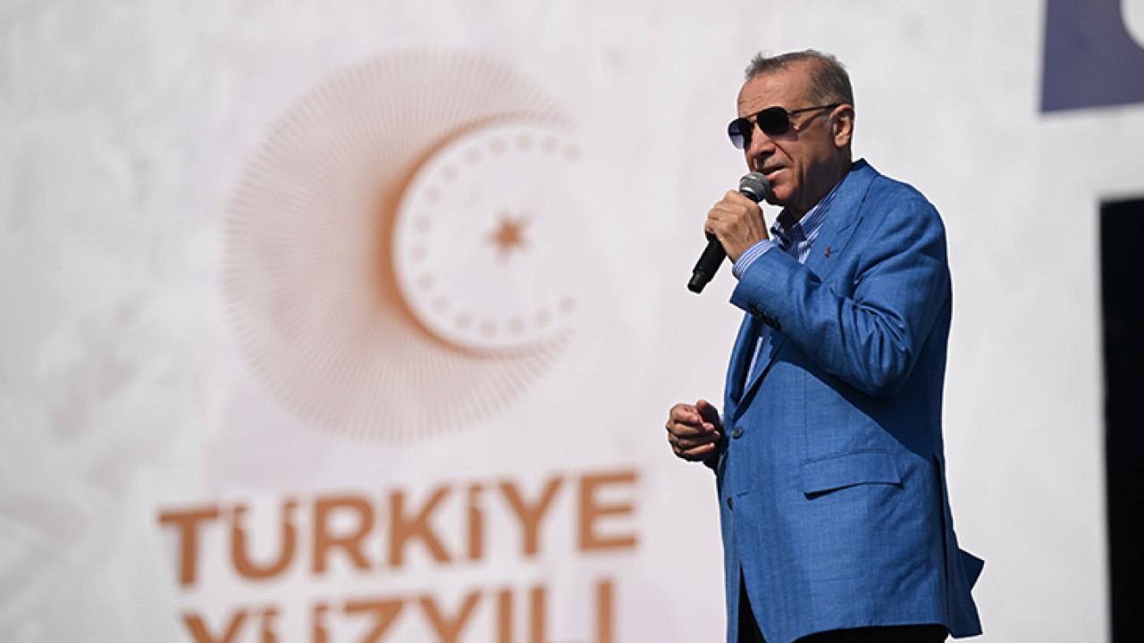 AK Parti'nin, Atatürk Havalimanı Millet Bahçesi'nde düzenlediği "Büyük İstanbul Mitingi"ne katılan ve eşi Emine Erdoğan ile beraber sahneye çıkan Cumhurbaşkanı Erdoğan, vatandaşları selamlarken, Cengiz Kurtoğlu'nun "Duyanlara Duymayanlara" şarkısına eşlik etti.
