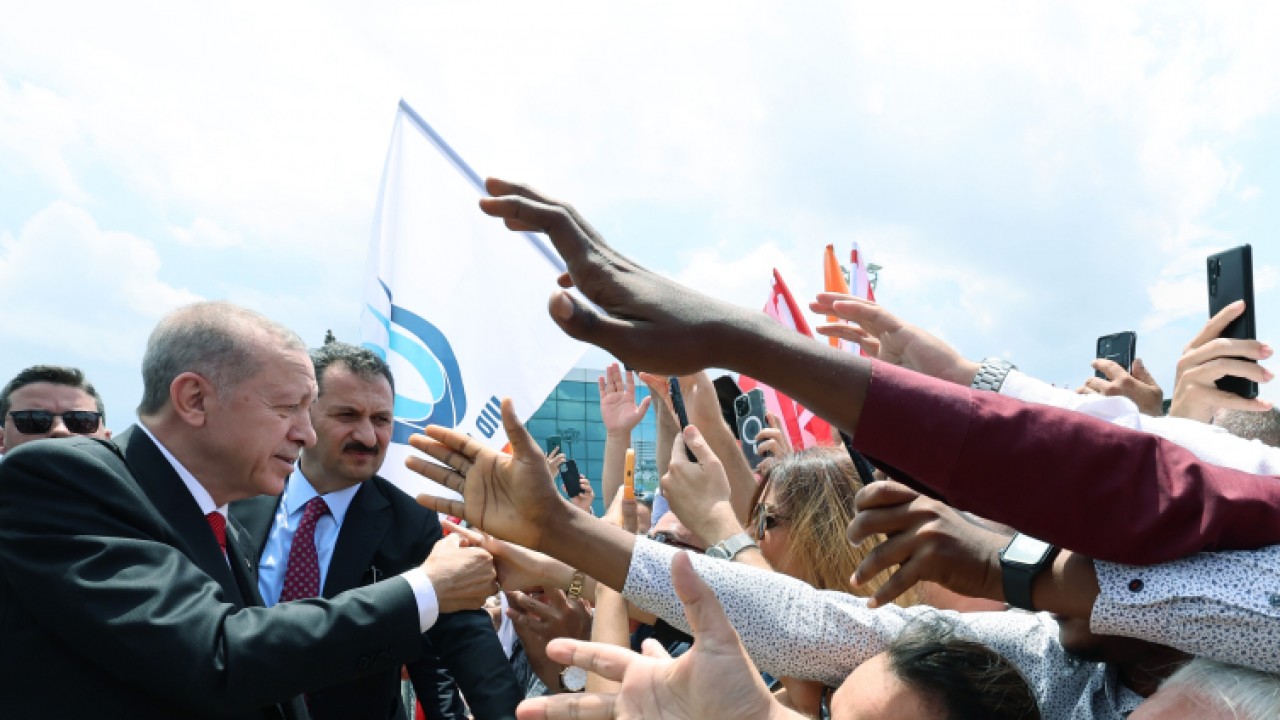 Erdoğan'a eşi Emine Erdoğan, Dışişleri Bakanı Hakan Fidan, Enerji ve Tabii Kaynaklar Bakanı Alparslan Bayraktar, Milli Savunma Bakanı Yaşar Güler, Ulaştırma ve Altyapı Bakanı Abdulkadir Uraloğlu, Cumhurbaşkanlığı İletişim Başkanı Fahrettin Altun, MİT Başkanı İbrahim Kalın, Savunma Sanayii Başkanı Haluk Görgün ve AK Parti Sözcüsü Ömer Çelik de eşlik etti.