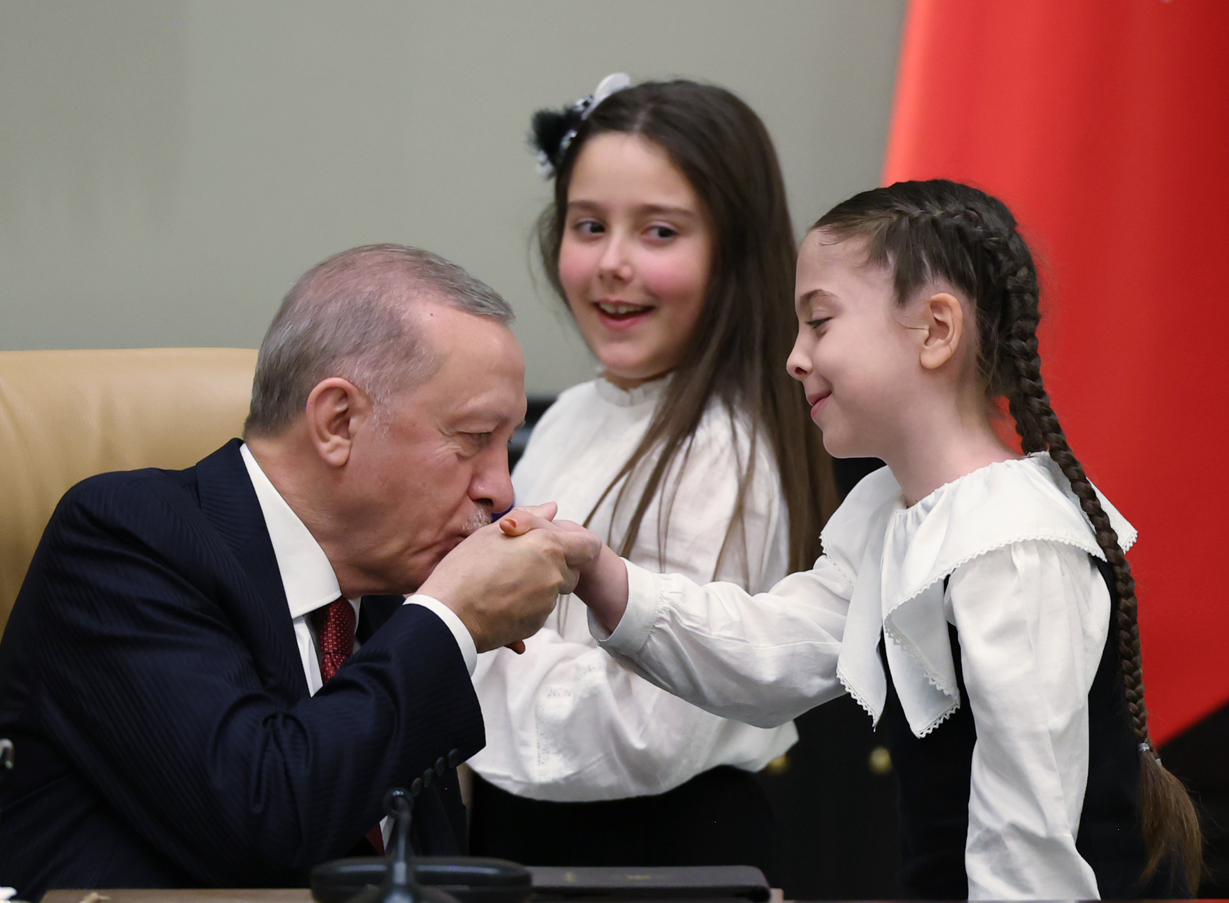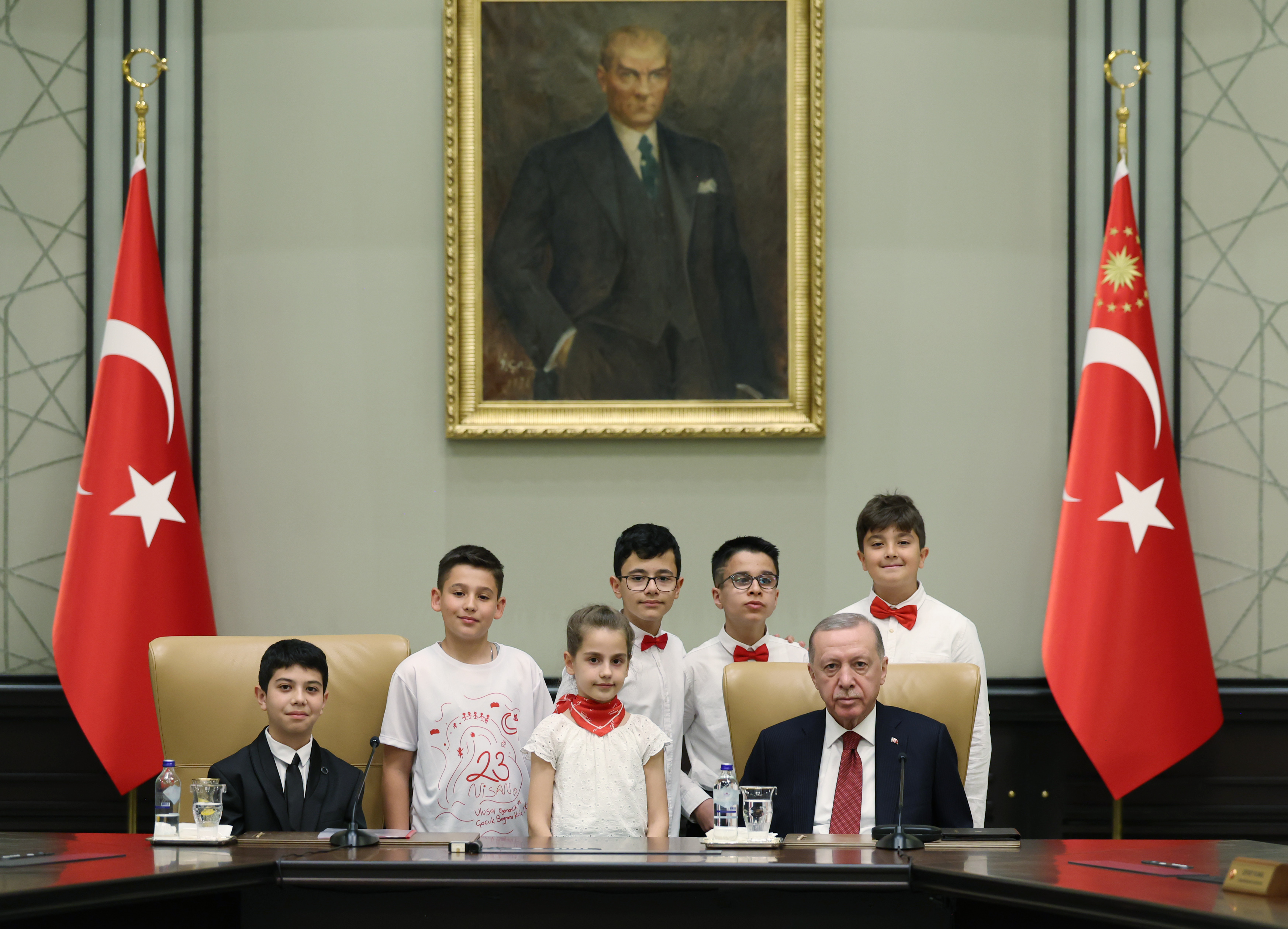 Gözümüzün nuru siz evlatlarımızın 23 Nisan Milli Egemenlik ve Çocuk Bayramı'nı tebrik ediyorum. Ülkemizdeki çocuklarla birlikte tüm dünya çocuklarının bayramını da sizleri Cumhurbaşkanlığı'nda misafir etmekten büyük memnuniyet duyuyorum. Bu vesileyle tüm dünya çocuklarına sizlerin aracılığıyla en kalbi sevgilerimi gönderiyorum.