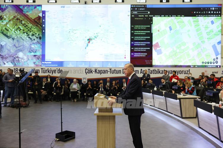 Depremlerin yaşandığı ilk saatlerin ve günlerin zorlukları aşıldıkça yürütülen çalışmaların daha sistematik ve etkili hale geldiğini belirten Erdoğan, AFAD merkezi ile iller arasındaki yakın koordinasyonla depremin etkilediği yerleşim yerlerine ulaşıldığını bildirdi.