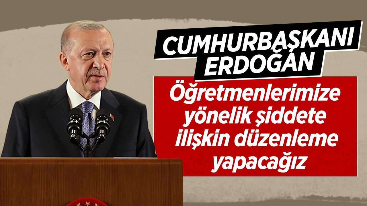 Cumhurbaşkanı Erdoğan, "Öğretmenlerimize ve diğer eğitim çalışanlarımıza yönelik şiddete ilişkin kapsamlı bir düzenlemeyi süratle hayata geçireceğiz. Bu fiilleri işleyenlerin cezasının ertelenmesi engellenecek, tutuklama sebebi sayılarak tutuksuz yargılamanın önüne geçilecek" açıklamasını yaptı.