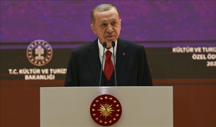 Kültür ve Turizm Bakanlığı 2022 Özel Ödüllerini alan kurumları tebrik eden Erdoğan, Bakanlığa, ödül alacak isimlerin belirlenmesinde emeği geçen değerlendirme kuruluna, toplantının düzenlenmesine katkı sunan herkese teşekkür etti.