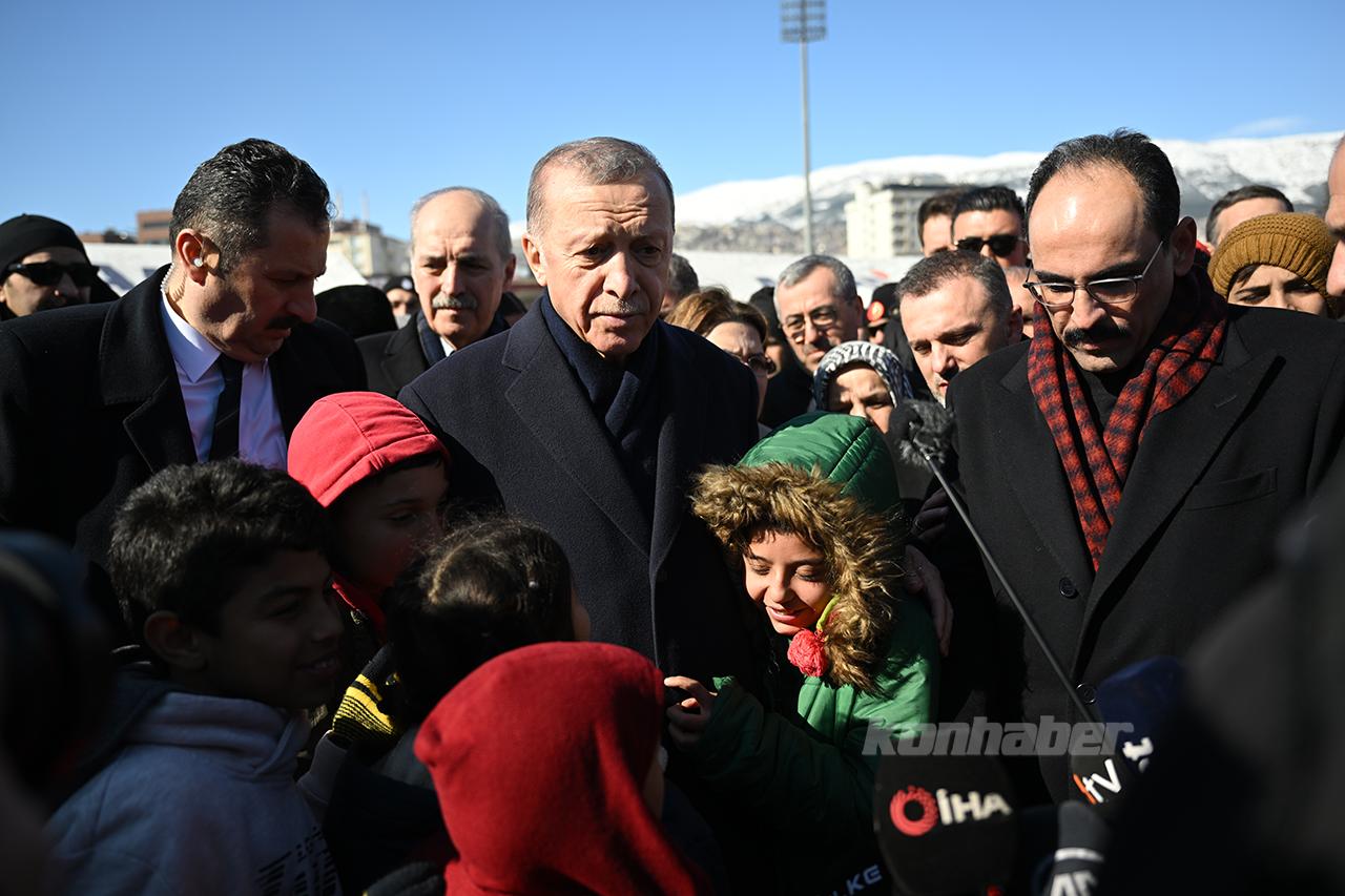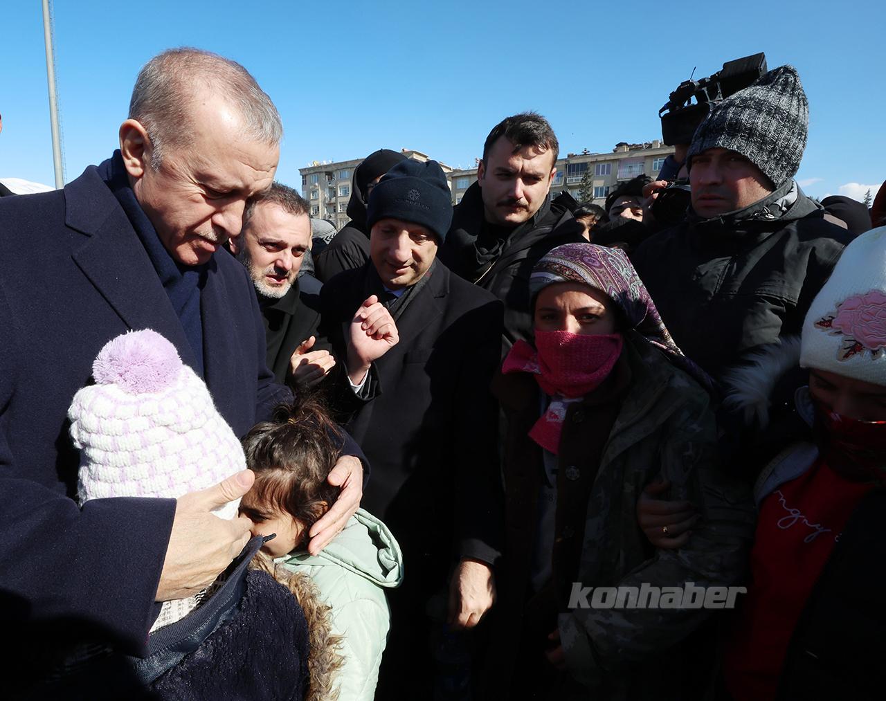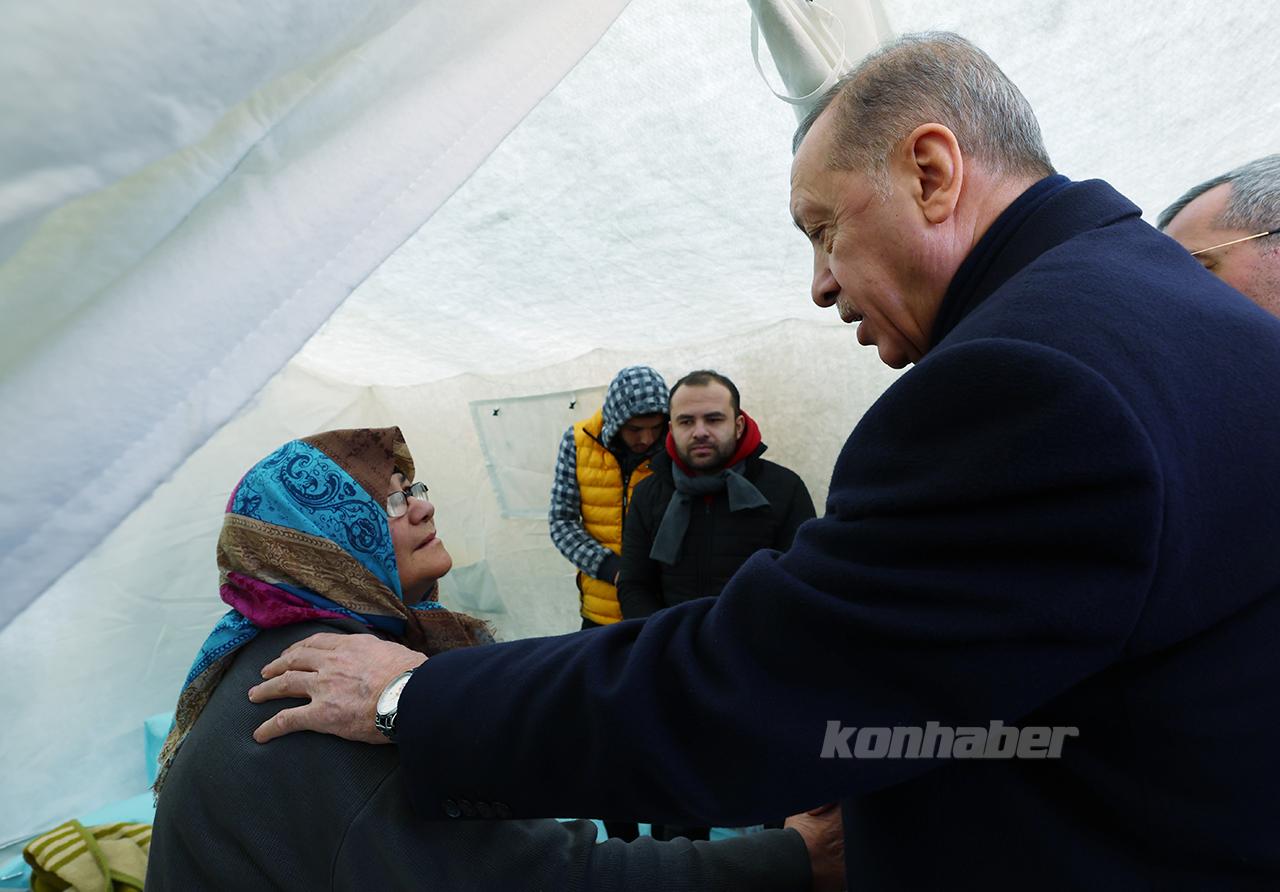 Burada incelemelerini sürdüren Cumhurbaşkanı Erdoğan, depremzedelerle bir araya gelerek, geçmiş olsun dileğinde bulundu.