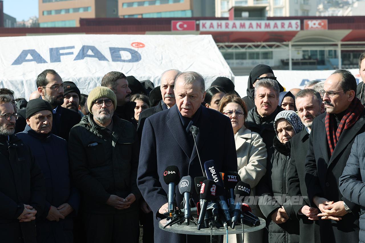 Kahramanmaraş Havalimanı'nda İçişleri Bakanı Süleyman Soylu ve diğer yetkililerden, depremlerin ardından yürütülen çalışmalara ilişkin bilgi alan Erdoğan, daha sonra 12 Şubat Stadyumu'nda AFAD tarafından kurulan çadır kentte geçti.