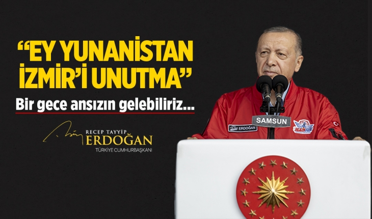 Yunanistan'a bizim tek cümlemiz var. İzmir'i unutma. Adaları işgal etmeniz filan bizi bağlamaz, vakti saati geldiğinde gereğini yaparız. Hani diyoruz ya bir gece ansızın gelebiliriz.Cumhurbaşkanı Erdoğan, konuşmasının diğer bölümünde şöyle konuştu: