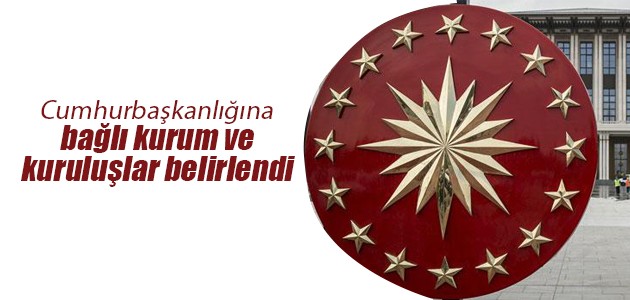 Buna göre, Devlet Arşivleri Başkanlığı, Devlet Denetleme Kurulu, Diyanet İşleri Başkanlığı Genelkurmay Başkanlığı, İletişim Başkanlığı, Milli Güvenlik Kurulu Genel Sekreterliği, Milli İstihbarat Teşkilatı Başkanlığı, Milli Saraylar İdaresi Başkanlığı, Savunma Sanayi Başkanlığı, Strateji ve Bütçe Başkanlığı ve Türkiye Varlık Fonu, Cumhurbaşkanlığına bağlı olacak.