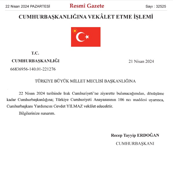 Cumhurbaşkanı Recep Tayyip Erdoğan'ın imzası ile Resmi Gazete'de yayımlanan karara göre, 22 Nisan 2024 tarihinde Irak ziyareti dolayısı ile Cumhurbaşkanı Erdoğan'ın dönüşüne kadar Türkiye Cumhuriyeti Anayasasının 106'ncı maddesi uyarınca Cumhurbaşkanlığına, Cumhurbaşkanı Yardımcısı Cevdet Yılmaz vekalet edecek.