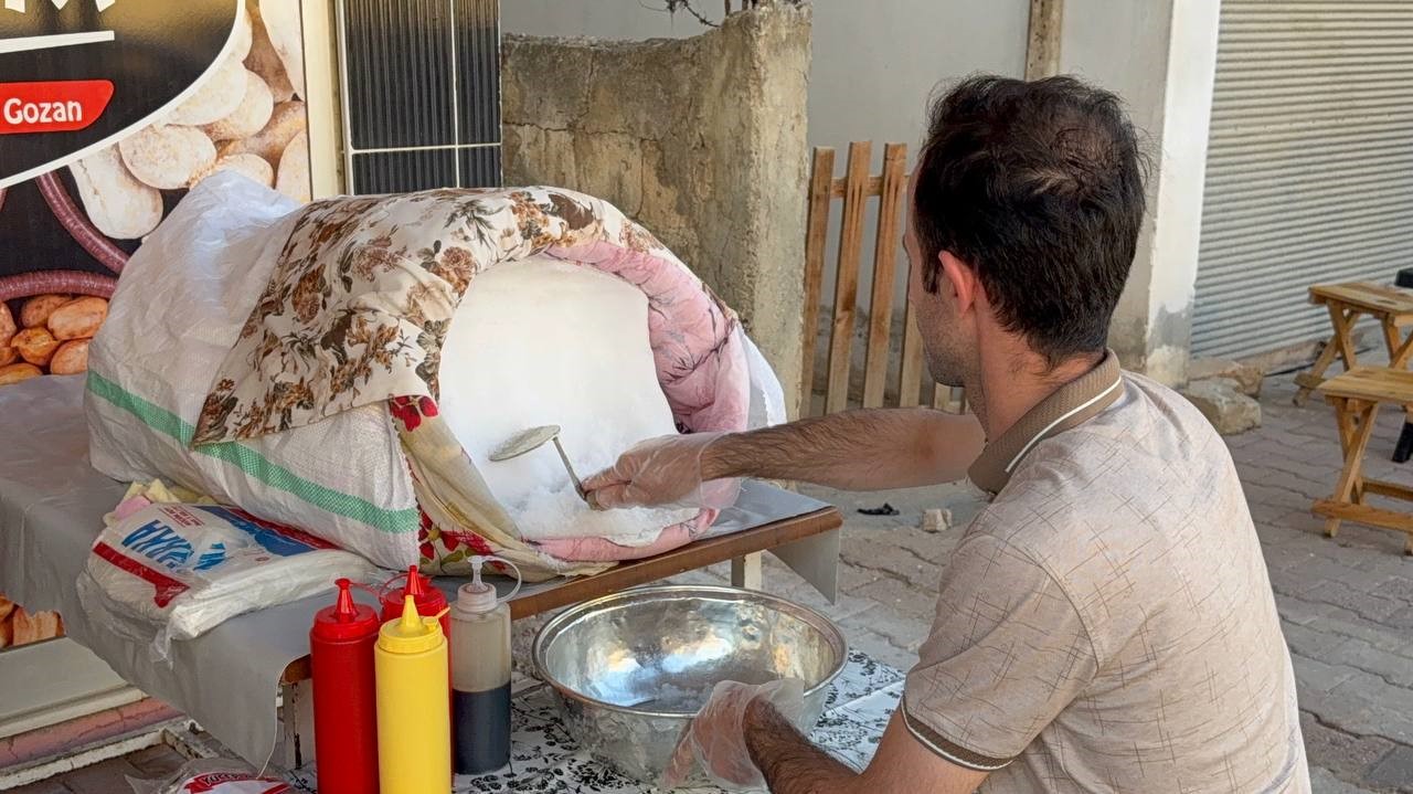 Adana'nın Kozan ilçesinde bir esnaf, dağdan getirdiği karı, pamuk, yorgan ve çuvallara sararak erimesini önledi, portakal ve vişne şuruplarıyla tatlandırıp satmaya başladı.