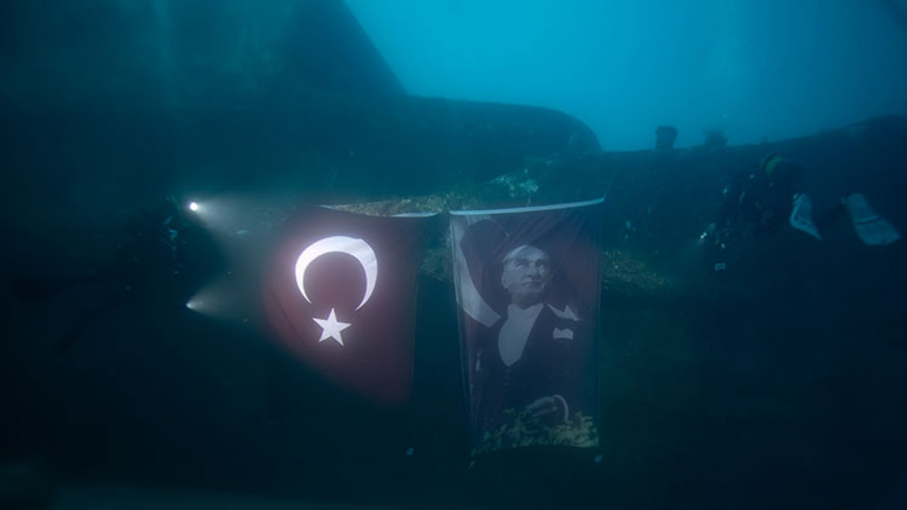 Dalgıçlar, ismini İzmir'in kurtuluş gününden alan vapurun batığına Türk bayrağı ve Atatürk posteri astı.