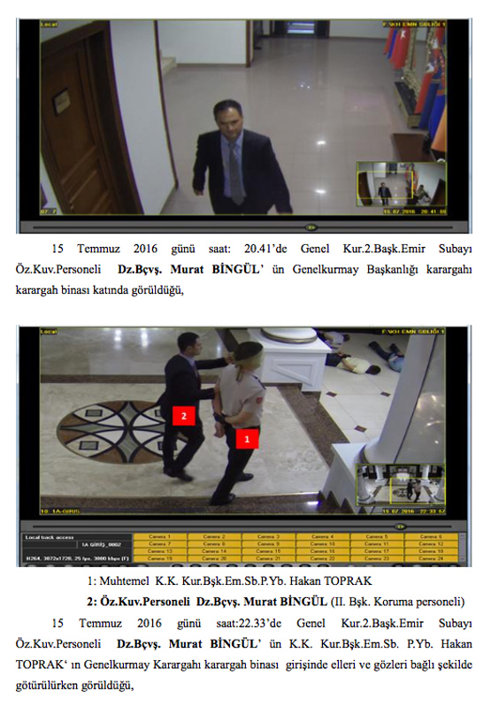 Kayıtlarda Bingül, saat 22.33'te elleri ve gözleri bağlı bir askeri karargah girişinde yere yatırılan diğer askerlerin yanına götürürken görülüyor. Bingül'ün, saat 23.19, 23.31 ve 23.53'te karargahın içinde rahatça dolaştığı, saat 02.52'de ise komuta katında bir askerle konuştuğu anlar da görüntülere yansıdı.
