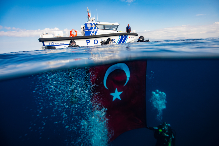 İzmir'in Çeşme ilçesinde 29 Ekim Cumhuriyet Bayramı kutlamaları kapsamında dalgıç polisler su altında Türk bayrağı açtı.