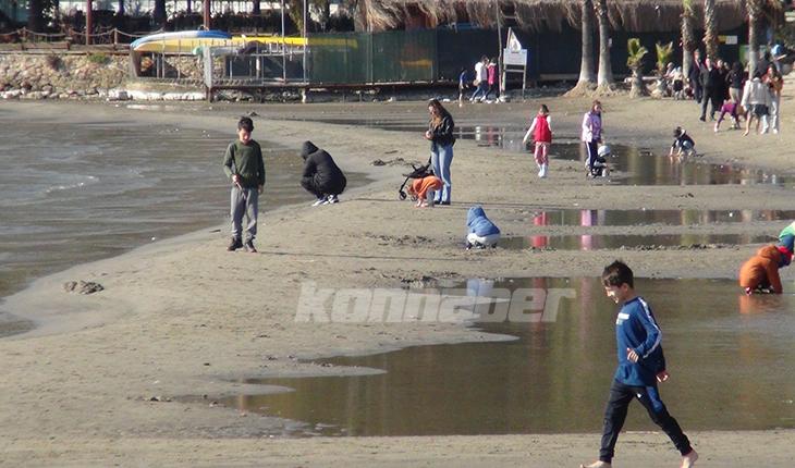 Akyaka Mahallesi'nde sahile gidenler, suyun çekildiği kumsalda yürüyüş yaptı, fotoğraf çektirdi.