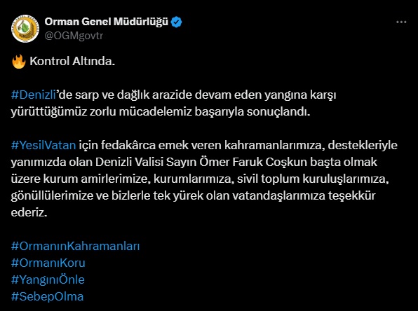 Yangın söndürme çalışmalarına 8 helikopter, 133 araç, 1075 personel, 12 ekskavatör, 15 dozer, 55 arazöz, 5 greyder ve 14 ilk müdahale aracının katıldığı öğrenildi. Yangının kontrol altına alındığı bilgisi ise Orman Bölge Müdürlüğü'nün sosyal medya hesabından yapılan paylaşım ile duyuruldu. OGM'nin yaptığı paylaşımda şu ifadeler yer aldı:"Denizli’de sarp ve dağlık arazide devam eden yangına karşı yürüttüğümüz zorlu mücadelemiz başarıyla sonuçlandı. Yeşil Vatan için fedakârca emek veren kahramanlarımıza, destekleriyle yanımızda olan Denizli Valisi Sayın Ömer Faruk Coşkun başta olmak üzere kurum amirlerimize, kurumlarımıza, sivil toplum kuruluşlarımıza, gönüllülerimize ve bizlerle tek yürek olan vatandaşlarımıza teşekkür ederiz."