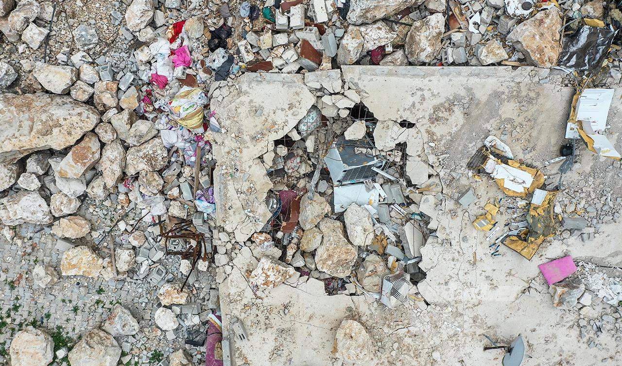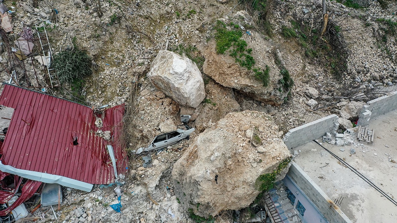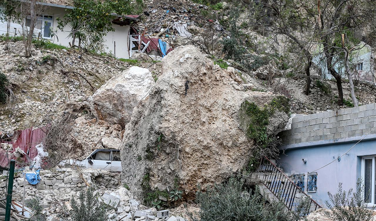 Hatay'ın Antakya ilçesinde depremin etkisiyle Habib-i Neccar Dağı'ndan kopan kayalar, dağın eteklerinde kurulu Hacı Ömer Alpagot Mahallesi'ndeki bazı evlerin yıkılmasına neden oldu.